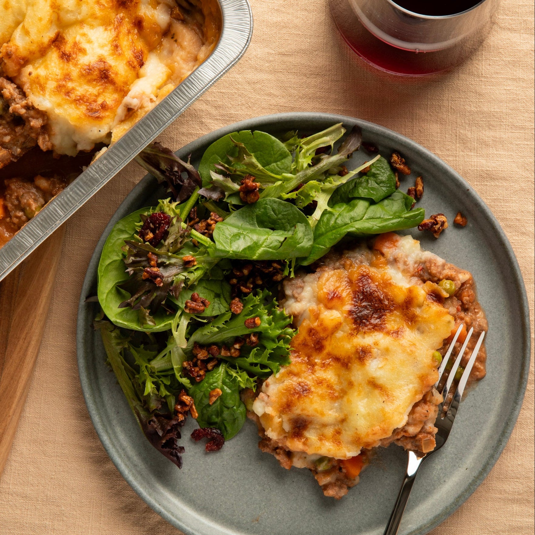 Angus ground beef with onions, peas, and carrots, topped with potato cheddar crust, served with baby spinach salad with cranberry, spiced pecans, and housemade poppyseed dressing